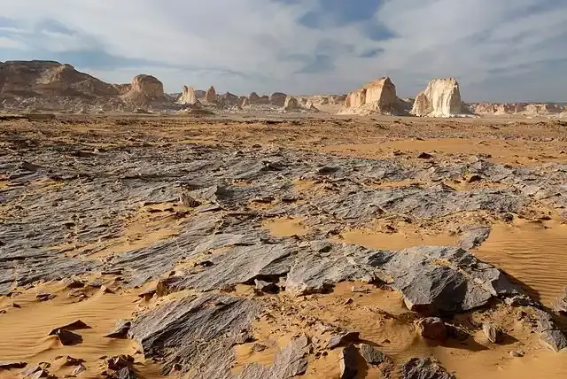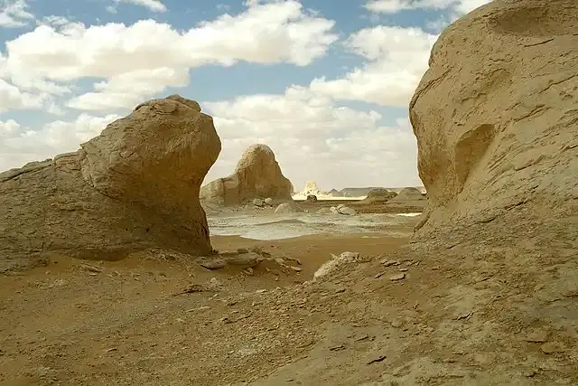 في غضون ثوانٍ من وصولك للصحراء البيضاء، ستبدأ فورًا بالتساؤل عن الأصول الغامضة لهذه الصحراء البيضاء، لأن جمالها المخيف يعمل كمحفزٍ قويٍّ للتذكير بأن كوكبنا يخضع لتغيرات مناخية قوية. من المذهل تمامًا الاعتقاد بأن هذا كان في يوم من الأيام بحرًا أو محيطًا وأن الدليل الوحيد المتبقي هو مجموعة من صخور الحجر الجيري المتكلسة التي نحتتها الرمال والرياح بمرور الزمن. أحينًا يصعب على المرء التصديق بأن تلك المنحوتات الجيرية لم ينحتها البشر ، فبعضها يحتوي على أشكال تبدو للوهلة الأولى كأنها أشكال مألوفة من صنع البشر، كما يبدو أيضًا أن تلك الأشكال التجريدية الطباشيرية تغير لونها اعتمادًا على الوقت من اليوم، وتتحول من الأبيض اللامع إلى الكريمي، ثم تصل إلى اللون البني الذهبي.