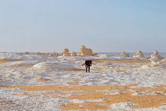 من المثير للدهشة في تلك الرحلة العحيبة أنك تبدأ الرحلة إلى الصحراء البيضاء عادةً بالتوقف عند منظر طبيعي متناقض تمامًا ... إنها الصحراء السوداء. تتميز هذه الصحراء بعدد لا يحصى من سلاسل الجبال الفريدة. يحمل كل واحد طبقة من الحجارة السوداء التي ألقيت من البراكين منذ ملايين السنين، مما أعطى المناظر الطبيعية الرملية اسمها الملون. بعد المشي لمسافات طويلة في إحدى القمم، يتضح أن هذه المنطقة خالية من أي علامة على الحياة باستثناء طريق واحد يمتد إلى الأفق. ومع ذلك، هذا ليس الطريق الذي يؤدي إلى الصحراء البيضاء. يتطلب الوصول إلى الصحراء البيضاء تفريغ إطارات سيارة الدفع الرباعي "لاند كروزر" والكثبان الرملية عبر الصحراء بزوايا مذهلة، حيث يعد التعرج والتسابق على الكثبان الرملية تجربة مدهشة للقلب تفسح المجال في النهاية للمنظر المذهل على الفور للصحراء البيضاء.