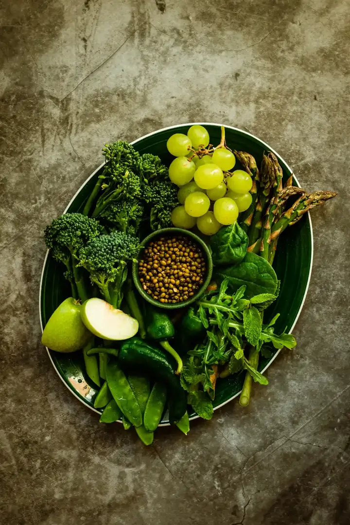 يلعب اللون الأخضر دورا كبيرا علي تحفيز تناول الطعام الصحي من الخضراوات والسلطات وحتى بعض الفواكه. يرتبط اللون الأخضر في المخ بالمأكولات المفيدة والصحية لذا؛ تدفعك الأطباق الخضراء للبحث عن الطعام الذي يشبهها في اللون.